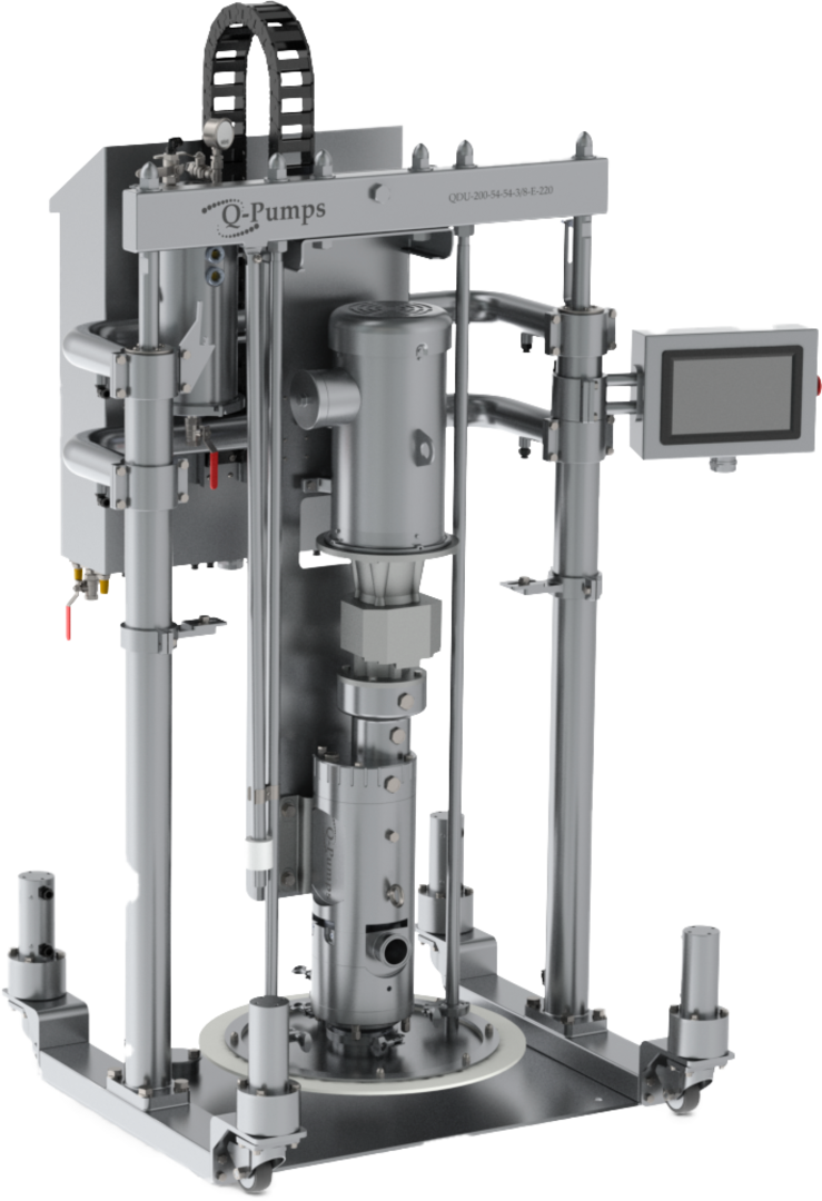 El QDU es un equipo de descarga de tambos diseñado con una bomba de doble tornillo QTS integrada a un motor eléctrico, lo cual permite el ahorro de consumo de energía